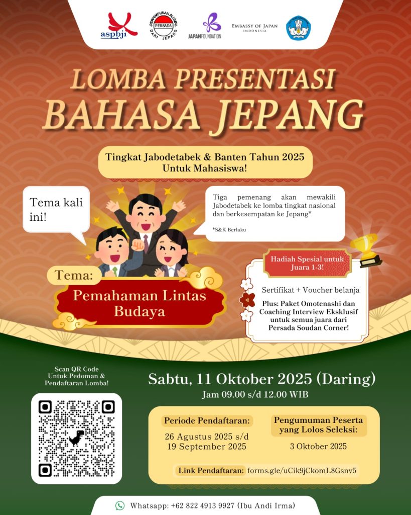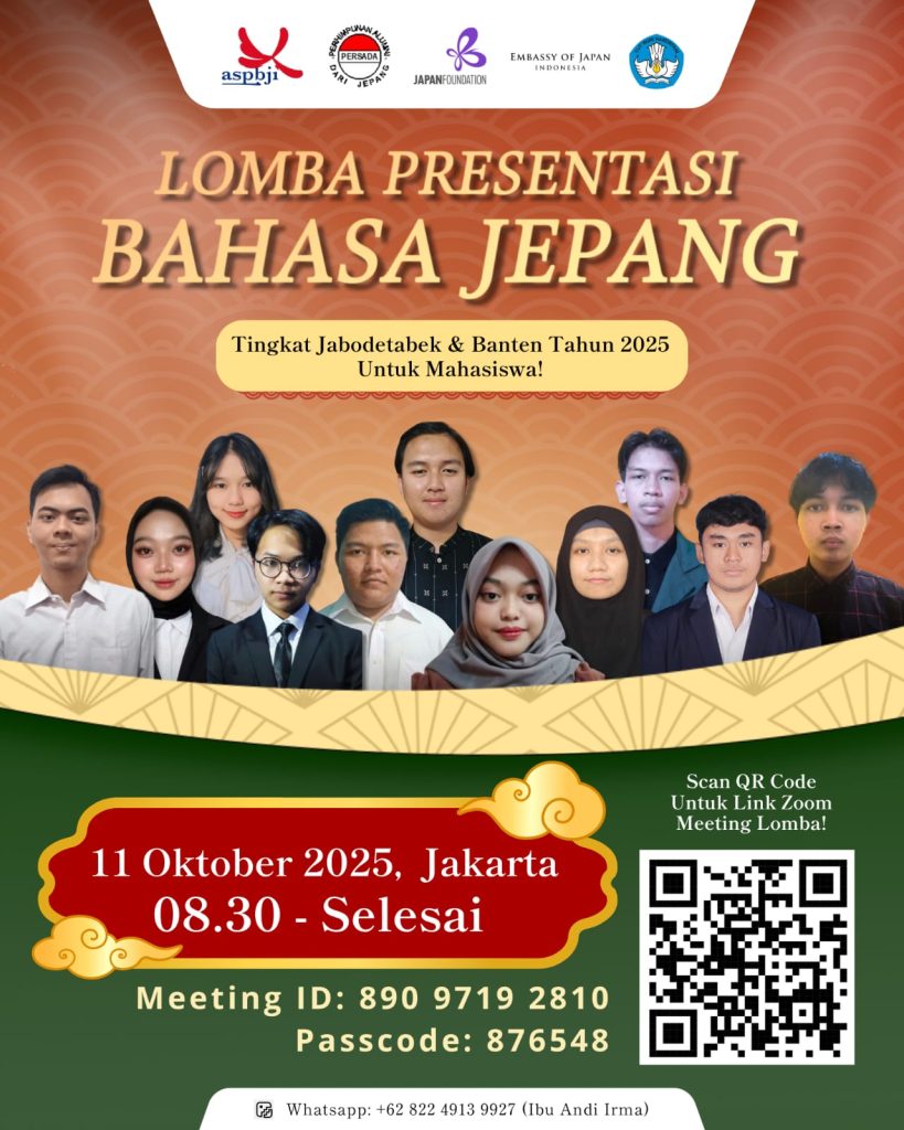 ASPBJI Jabodetabek, PERSADA, dan Japan Foundation didukung oleh Kedutaan Besar Jepang di Jakarta dan Kementerian Pendidikan Tinggi, Sains, dan Teknologi mengadakan Lomba Presentasi Bahasa Jepang Tingkat Wilayah Jabodetabek Tahun 2025 (Untuk Mahasiswa).
